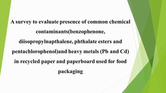 A survey to evaluate presence of common chemical contaminants ( benzophenone , diisopropylnapthalene , phthalate esters and pentachlorophenol )and heavy metals (Pb and Cd) in recycled paper and paperboard used for food packaging |