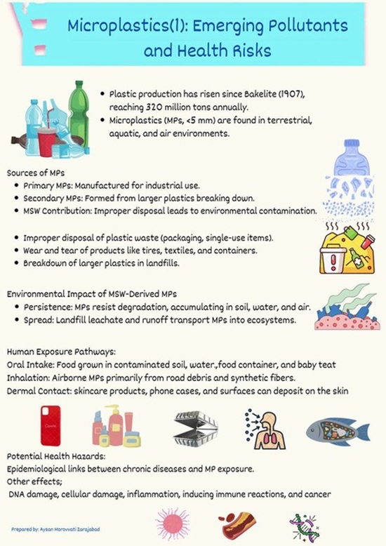 Sources of microplastics include primary particles designed for industrial use and secondary particles formed from degrading larger plastics. Improper management of municipal solid waste exacerbates their environmental impact, leading to their persistence and dispersion through landfill leachate and runoff.